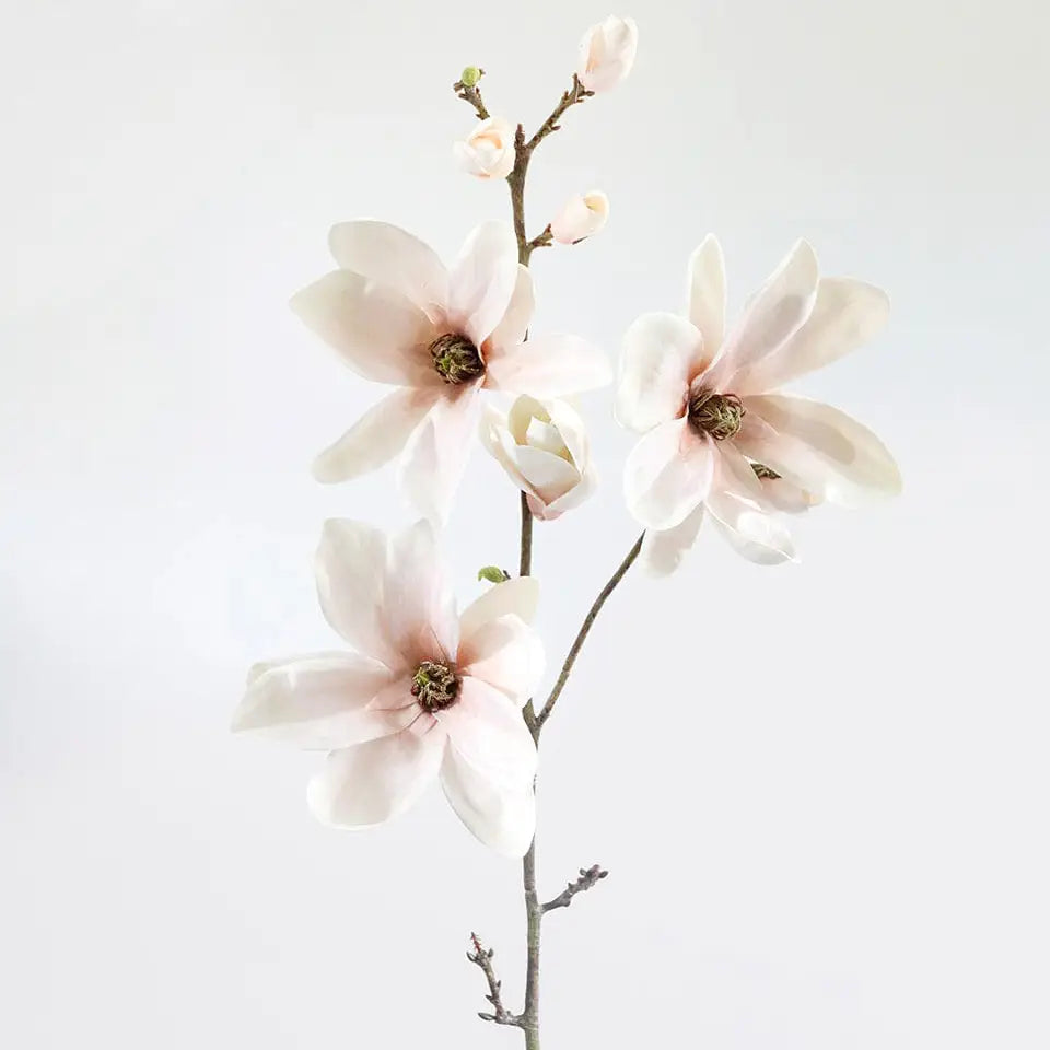 Elevate your home decor with the delicate beauty of our artificial blush pink magnolia branch. This faux blossom branch features three open blooms and multiple magnolia buds, each crafted to perfection for a lifelike appearance. The open blooms are designed with wired petals, allowing you to arrange them fully or partially open, adding a touch of realism to your floral displays. Ideal for creating a statement piece, these premium magnolia flowers bring elegance and sophistication to any setting. Whether placed in a vase as a standalone arrangement or combined with other florals, just a few stems are all you need to make a striking impression. Crafted from high-quality materials, these artificial magnolia branches offer the timeless beauty of fresh flowers without the maintenance. Perfect for any room in your home, they add a soft, romantic touch that enhances your decor throughout the seasons.