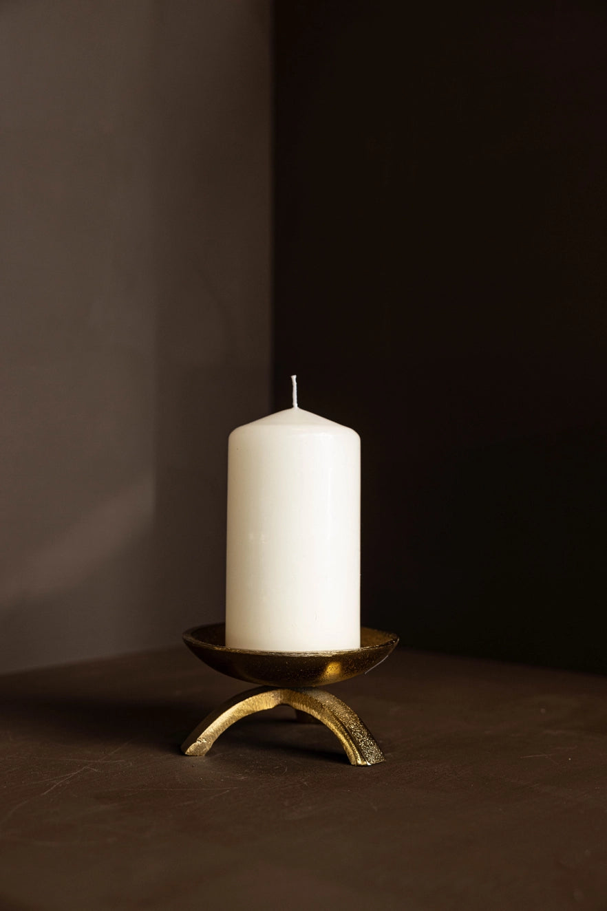 3" W x 2.5" H The Brass Tripod Pillar Candle Holder by Luxe B Co is a simple addition to your home that makes a big impact. Add these candlesticks to your mantle, shelves, or dining tables to bring the soft brass tones to your home decor. Candle not included Made in India