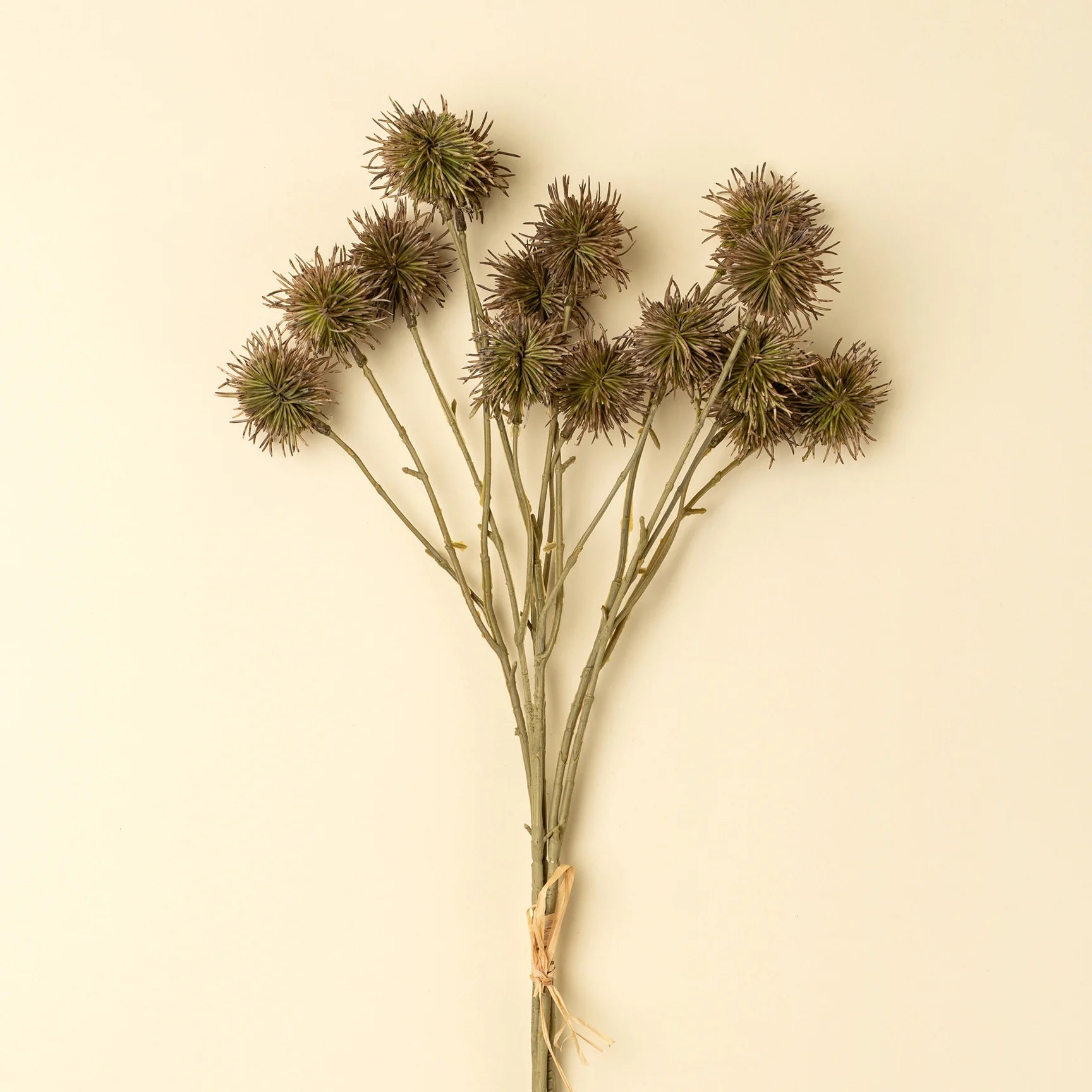 The Chestnut Ball Bouquet in Purple Green is an earthy, sculptural addition to your accent decor. With spiky, lifelike orbs in moody natural tones, this stem brings bold texture and visual interest to styled vases. Each stem is bendable for easy arranging and feels incredibly realistic, offering the charm of nature without the maintenance.