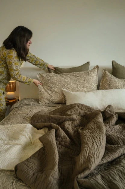 Add depth and warmth to your bedroom with the Cloud Kantha Comforter in Carob. Crafted in a rich brown hue, this comforter is perfect for layering, bringing an inviting touch of colour and texture to your space. Its handcrafted kantha stitching adds subtle detailing, making it as visually appealing as it is cozy. Whether draped over your bed or folded at the foot for an extra layer of warmth, this piece seamlessly blends comfort and style.