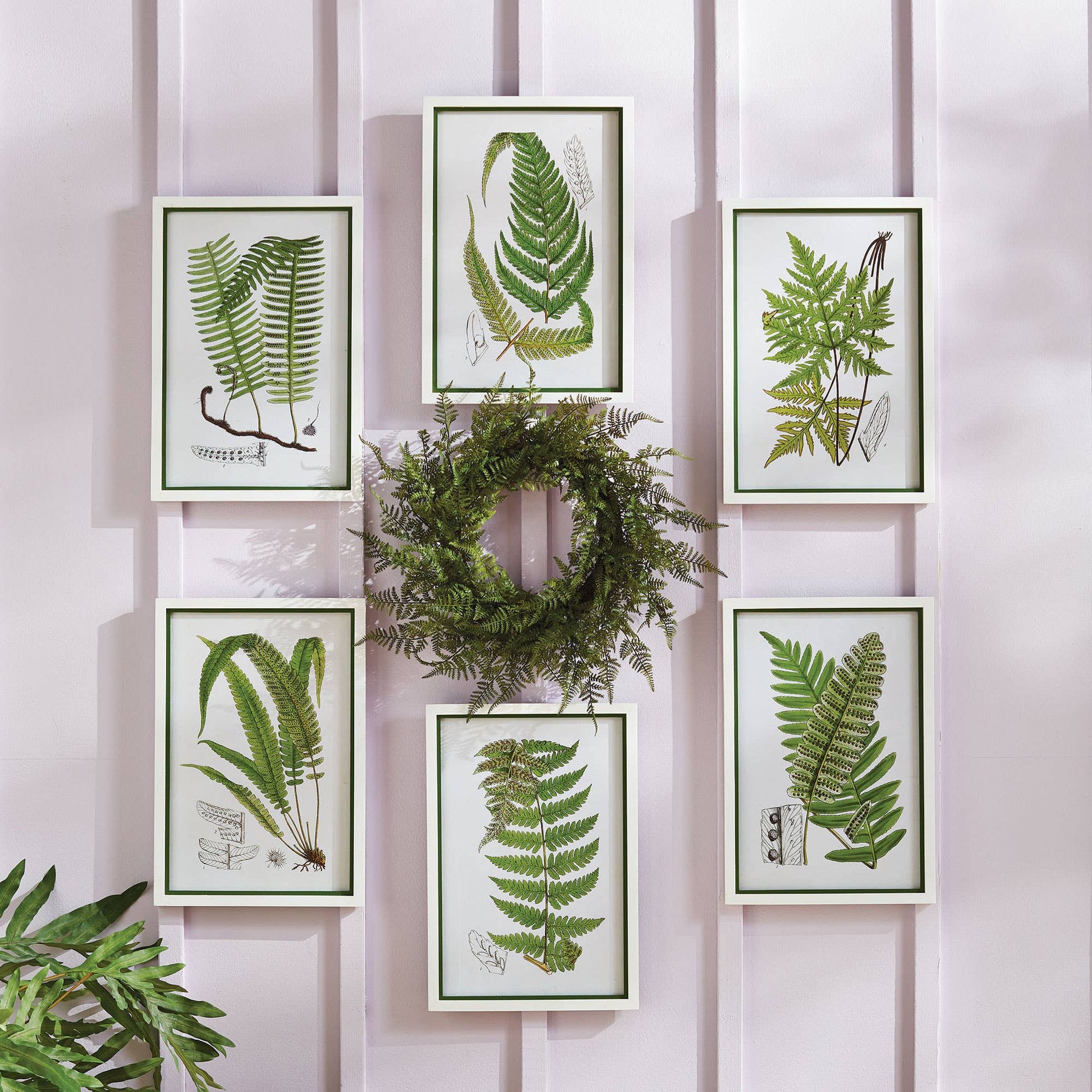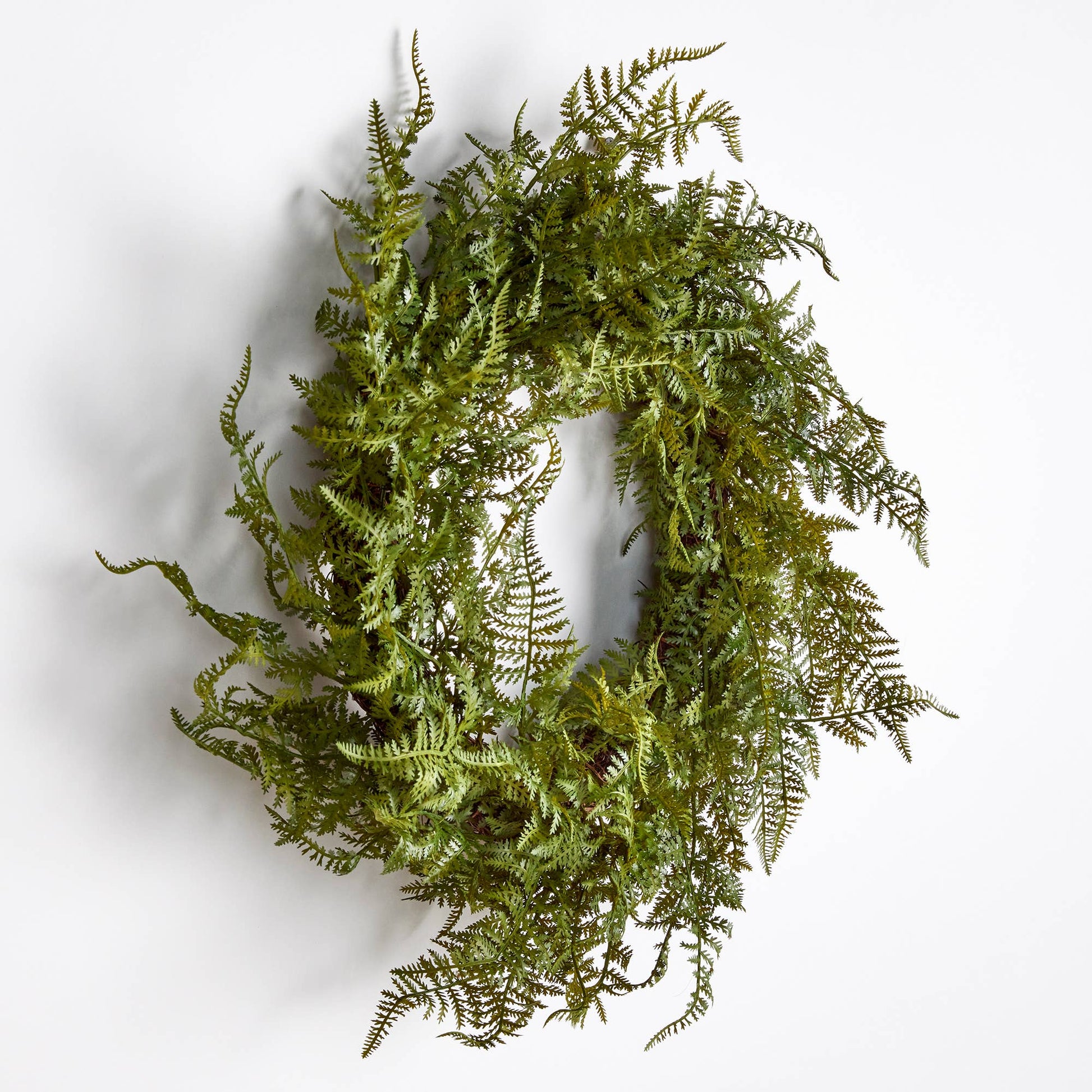 This fern wreath is full and lush. Soft faux fern stems assembled and generously applied, and comes with a twine loop for hanging. Simply beautiful on its own, or a great Base to add additional floral stems or eucalyptus leaves, for more variety . . Interior use. Dust with dry cloth. Avoid moisture and direct sunlight.