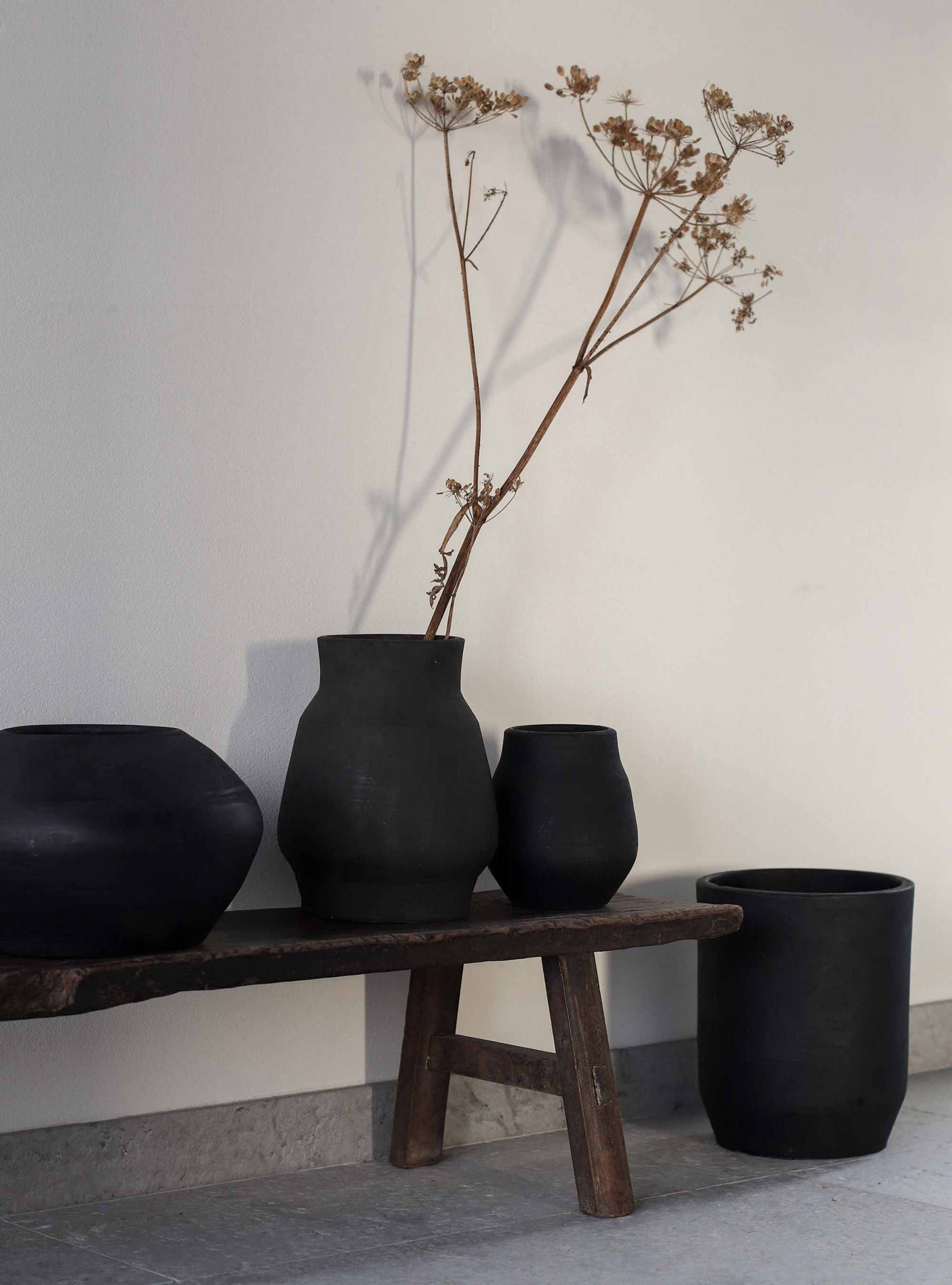 Beautiful black handmade earthenware pot. Hero is a decorative rustic pot that is made according to old traditions. Each piece is made by hand making each pot unique. Colore e forma può essere differenza da immagini. The inside of the pot is treated with wax to withstand some moisture. If you want to use it as a vase, we recommend placing a glass or other protection inside against prolonged contact with water. The Hero pot is available in two sizes, Small and Large, and is also beautiful to use in the kitchen for storing utensils.
