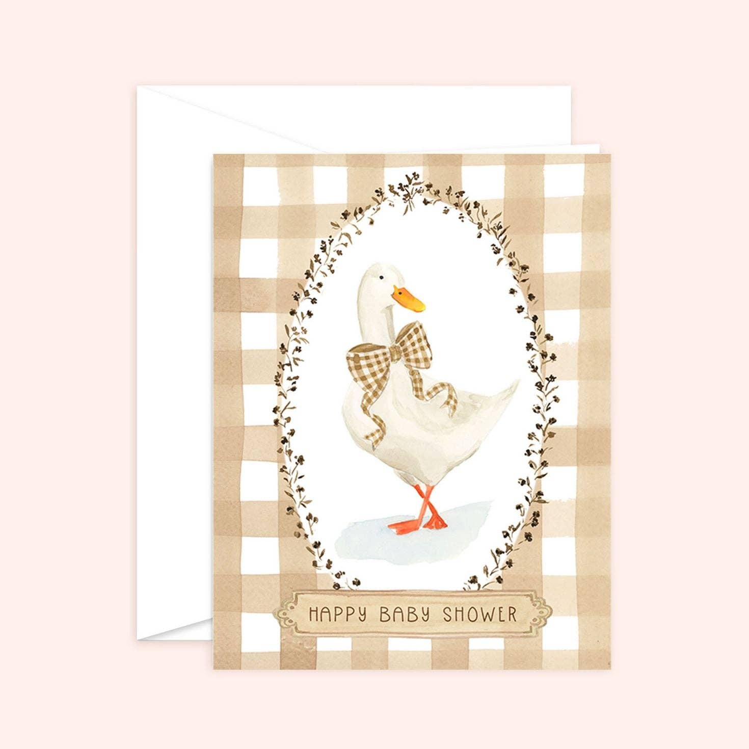 Celebrate the arrival of a little one with this adorable baby shower card, featuring a charming goose illustration and a soft beige plaid background. The gentle, earthy tones and playful design create the perfect atmosphere for welcoming a new bundle of joy.