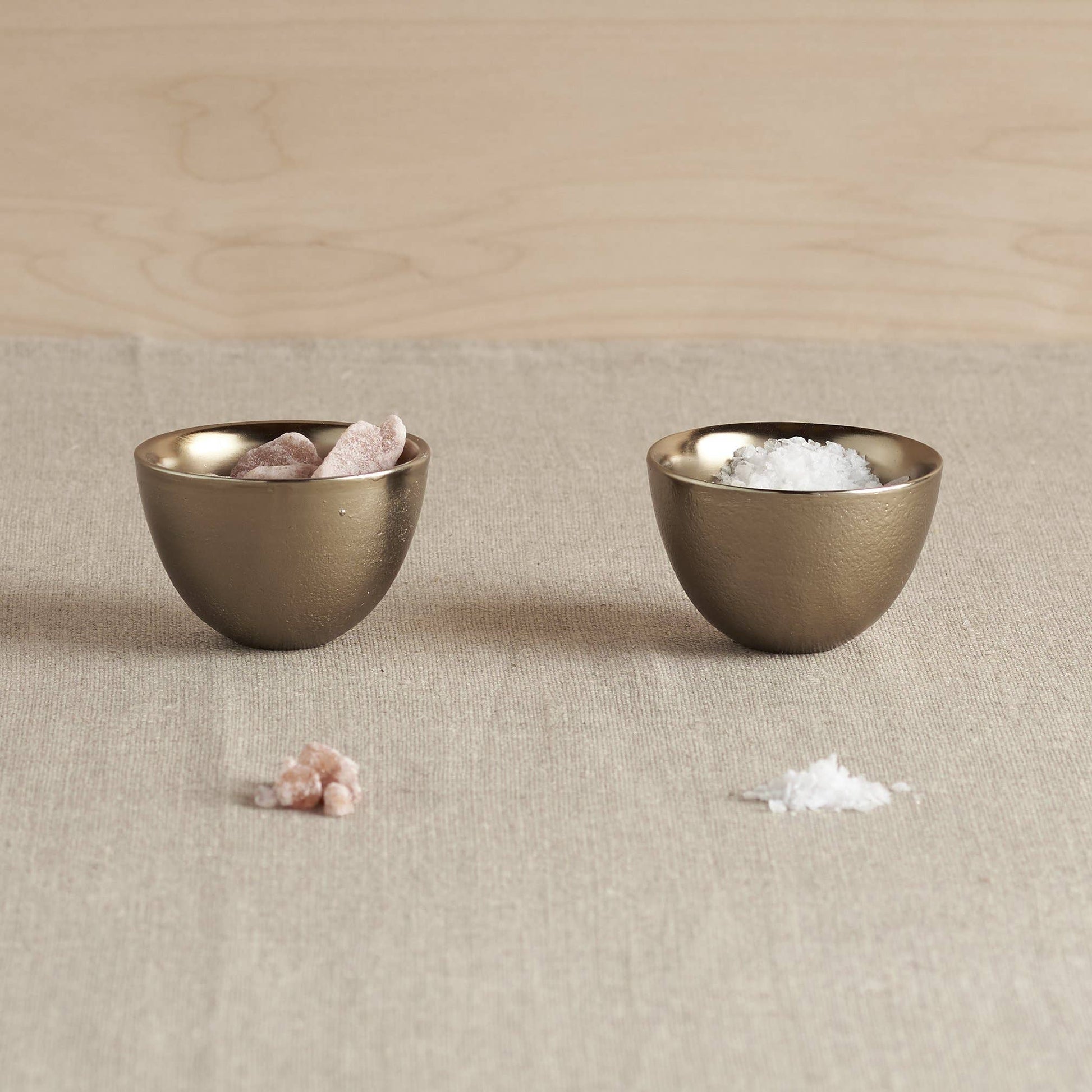 Small yet handy bowls are an ideal size for holding snacks or trinkets, or for staying on the table to offer a pinch of salt or pepper. Made from hand-cast aluminum, these gently rounded dishes feature a slightly textured exterior and satin-smooth interior plated with a food-safe antiqued brass finish. Dimensions: 3" dia x 2" h