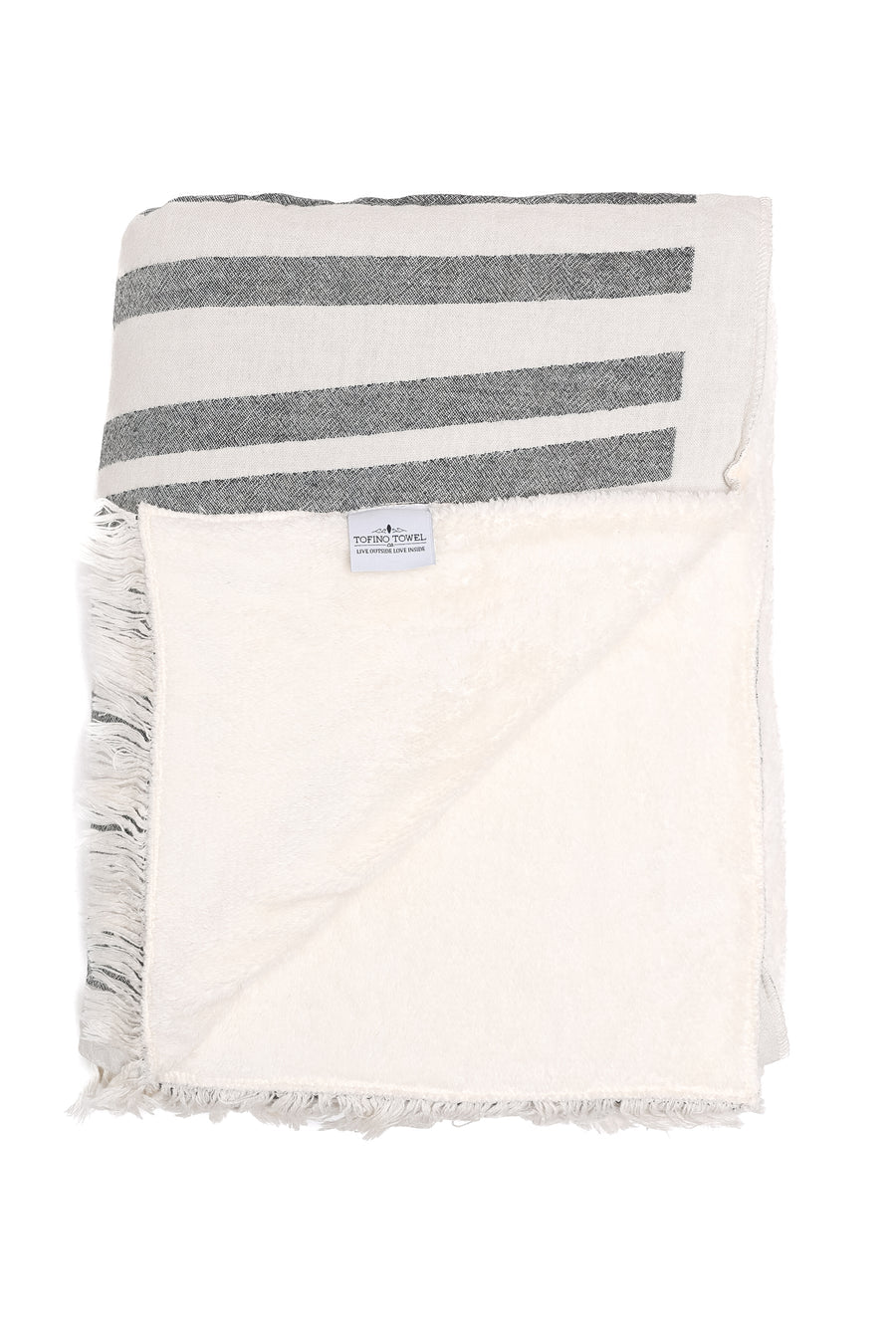 Our custom designed Rowyn throw is made from super soft luxe Turkish cotton, eyelash fringe, and cozy fleece lining. Created to look like ripples on the ocean this neutral design brings tranquility to any space.