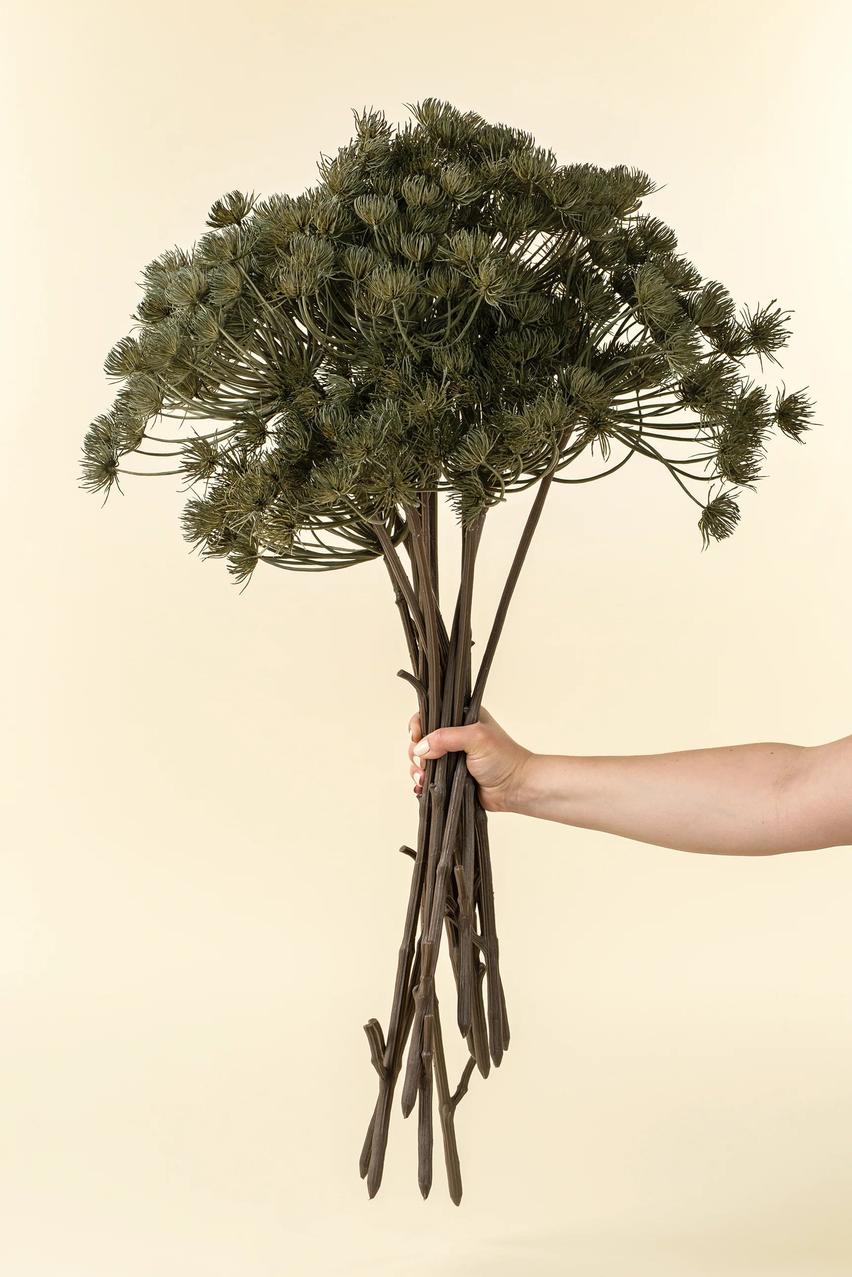 Bring bold texture and natural elegance to your space with the Wild Angelica Stem in deep forest green. This sculptural faux flower makes a dramatic statement with its umbrella-like bloom and long, graceful stem. It's perfect for adding height and dimension to styled vases.